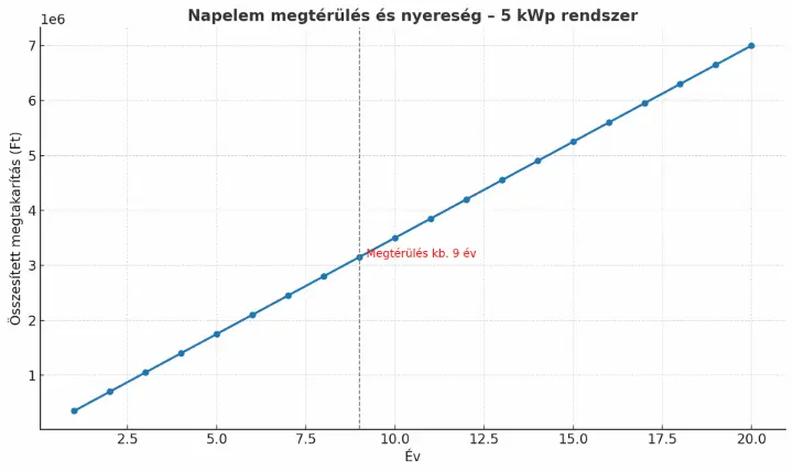 👉 Magyarán: nagyjából 9 évig a napelem dolgozik a saját árának visszahozásán, de utána még legalább 11 évig tiszta hasznot termel a háztartásnak.